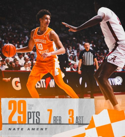 As you can tell by the above graphic, Mr. Ament sure did deliver in a big way. The usual catalyst for the Vols, Ja'Kobi Gillespie went for 24 points in the contest and had a pair of key steals. Tennessee was in an early hole in this one, but used the momentum gained going into halftime to springboard a 14-2 run in total to seize control. With this win in hand, Tennessee moved back up the seed list to a safe 6-seed for now. Holding Bama to 23% shooting from downtown should build some confidence for Rick Barnes' defense which is still finding itself.
