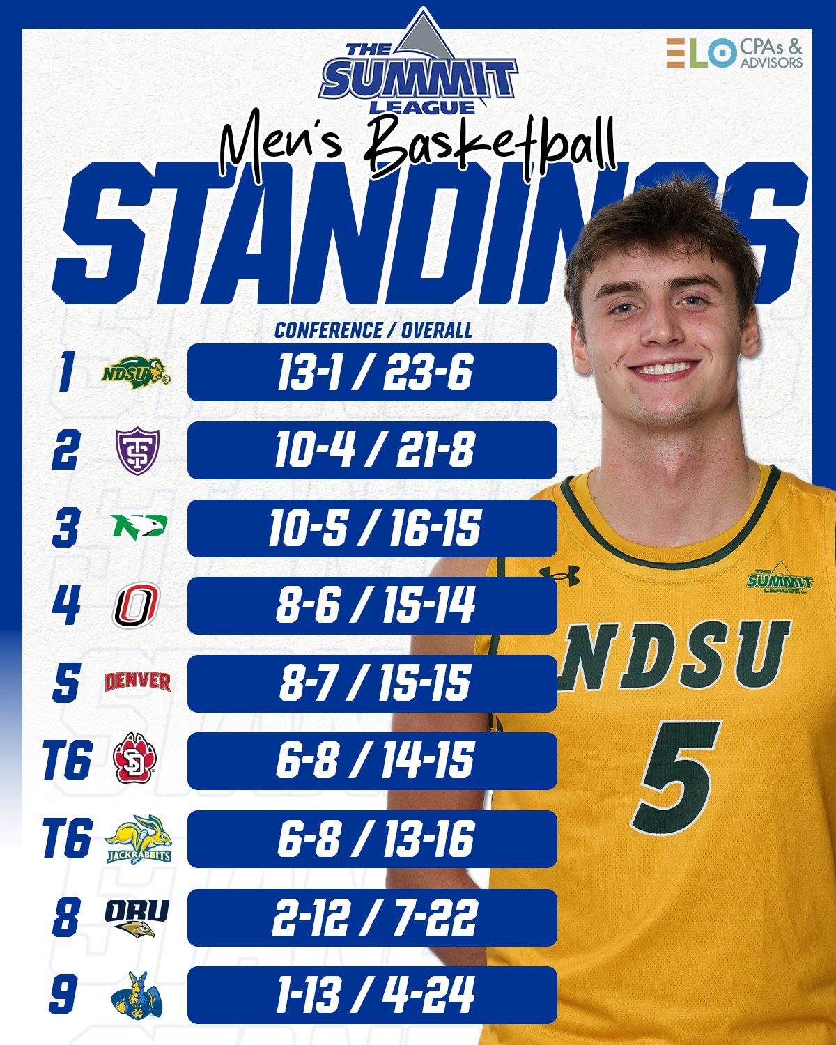SUMMIT: NORTH DAKOTA STATE - These Bison are drama killers. NDSU has been so consistent with winning that the race has been called. Your 2025-26 Summit League regular-season champs: The North Dakota State Bison. At 13-1 in conference, NDSU has stymied nearly every team at least once. The Summit League's top defense boasts defensive rebounding, not fouling, the highest rate of steals, and the second-highest rate of forced turnovers. It has proven to be very difficult to get comfortable and set up your offense against NDSU. The Bison went to South Dakota State last week and beat the Jackrabbits, 74-66. The defense produced seven steals and limited the home side to just 14 free throw attempts. The Bison wrapped up the week with an absolute clinic in Kansas City, holding the Roos to 59 points in a 95-59 shellacking.