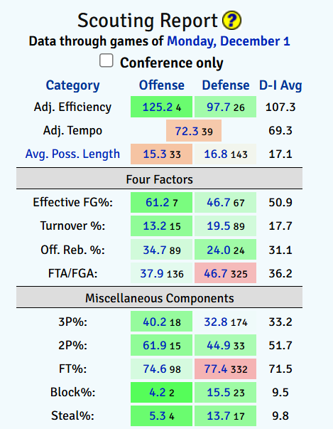 Vanderbilt's roster is built really intelligently. There is offensive firepower everywhere you turn. On defense, Devin McGlockton plays larger than his 6'7 height and 6-10 Jalen Washington is becoming a key stop gap. Washington had a pair of blocks against massively tall Saint Mary's. The Saint Mary's win will age very well and the wins over VCU and WKU provide non-conference resume depth to a ledger that already had a road win over improved UCF on it. Vandy continues to trend up in the SEC pecking order, and until further notice has to consider themselves a contender in the loaded conference race.