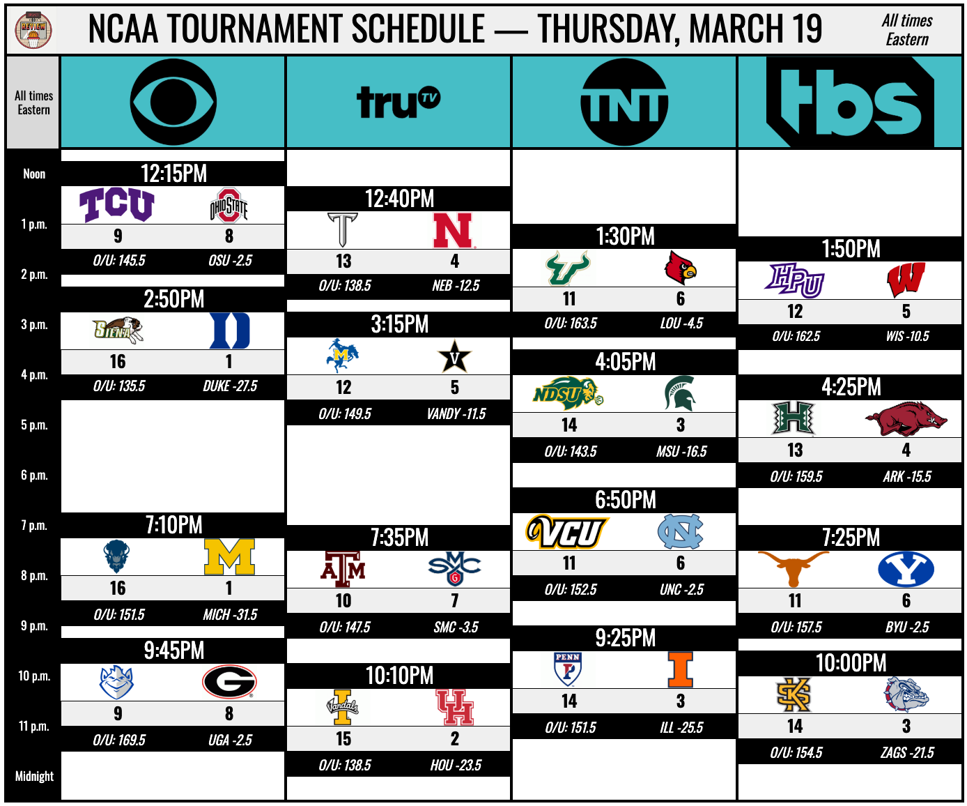(1) Michigan (-31.5) vs. (16) Howard, 7:10 PM ET, CBS.
