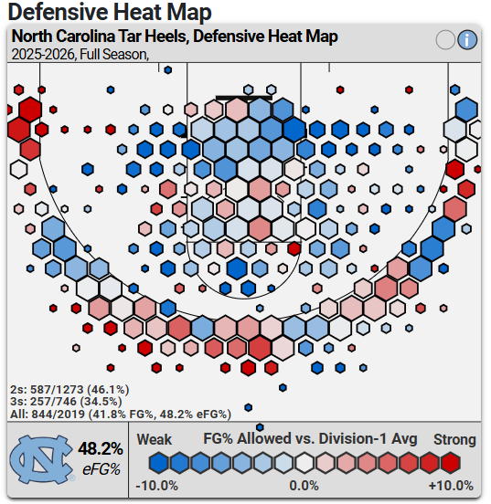 VCU’s first task will be figuring out how to score against UNC’s drop coverage. With Henri Veesaar patrolling the paint, UNC forces a huge diet of midrange jumpers. Per KenPom, the Heels rank 4th nationally in average 2PA distance allowed, and their defensive shooting heat map via CBB Analytics displays that tendency: