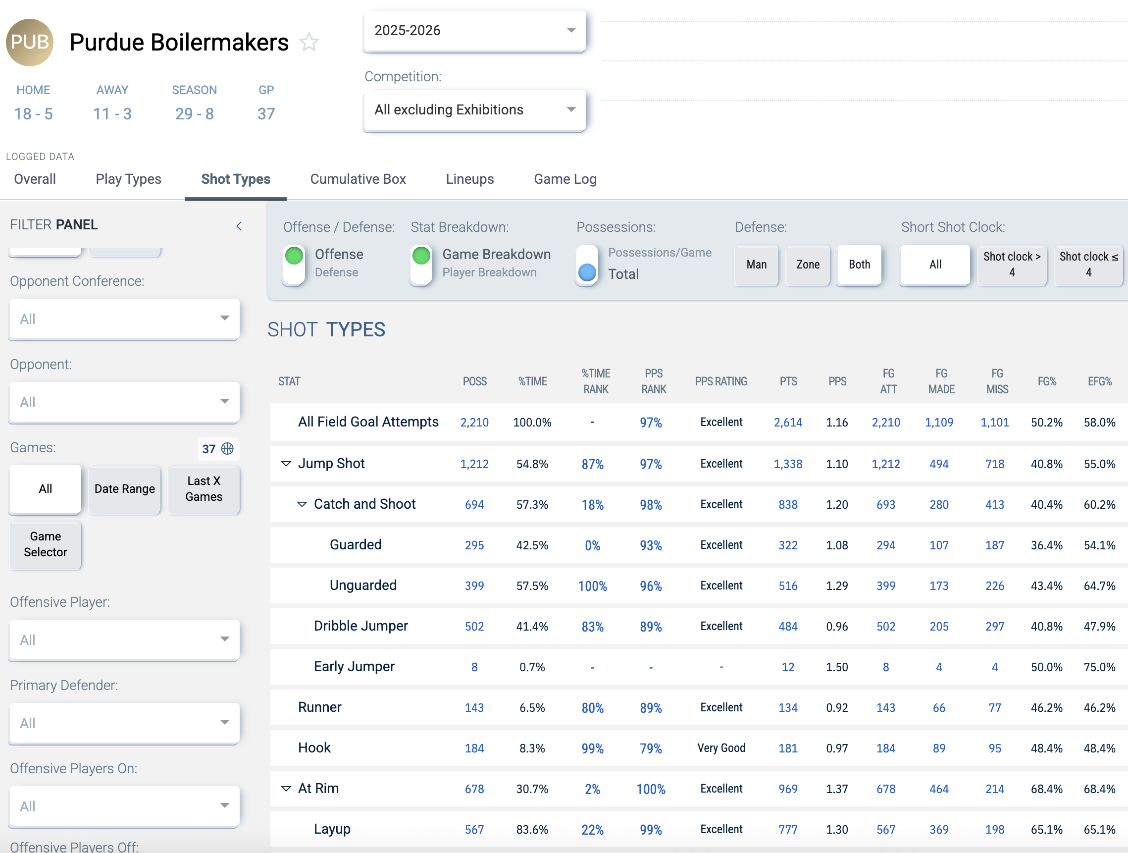 First of all, wow. I can see how Purdue leads the country in offensive efficiency. But the key category here is points per shot. The Boilermakers are amazing at everything, but their catch-and-shoot and rim attempts both net them over 1.2 points per shot, while their dribble jumpers, runners, and hook shots (largely Smith and Kaufman-Renn terrain) set them around 0.92 to 0.97 points per shot.