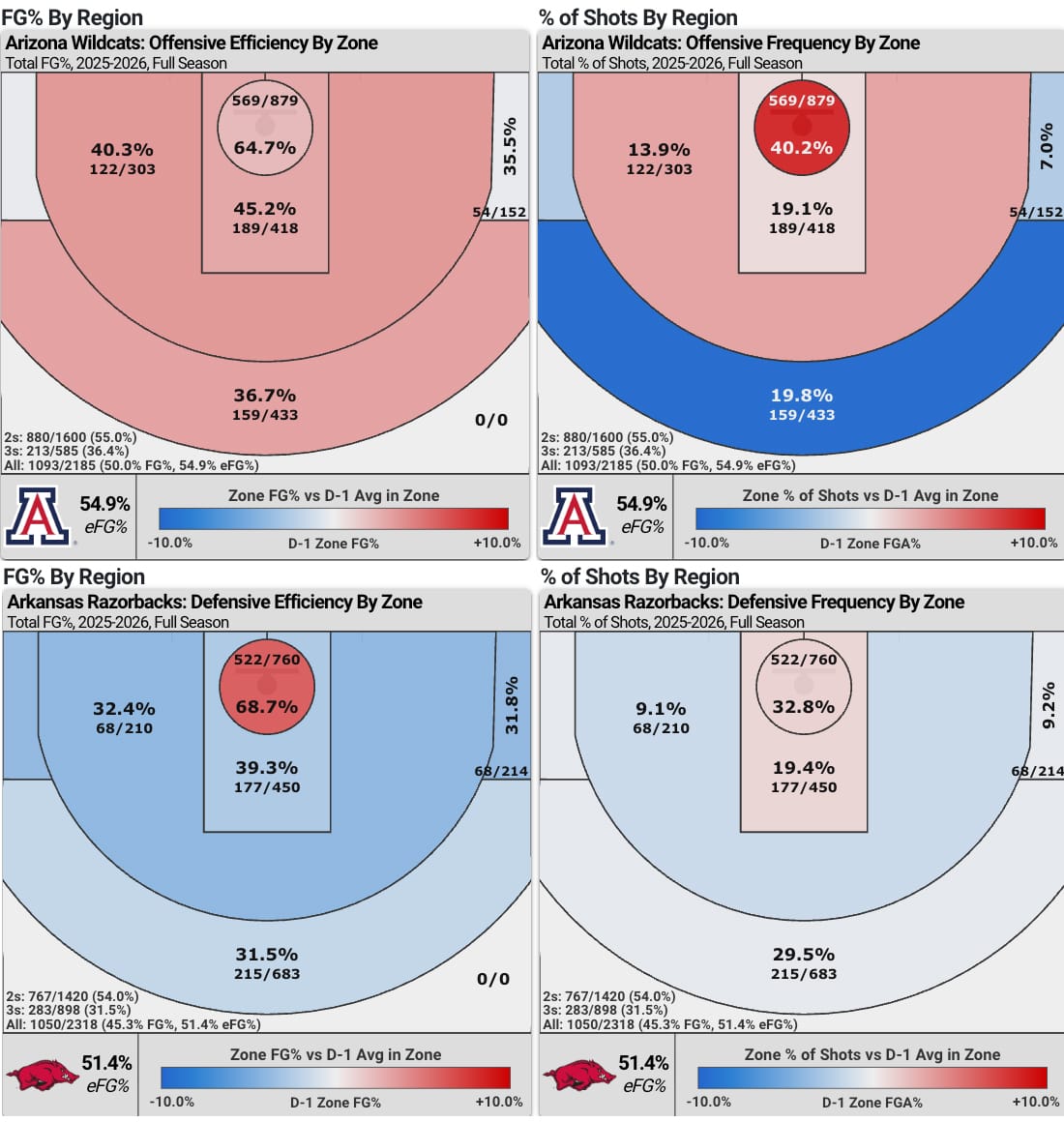 78th percentile rim rate allowed with a 15th percentile efficiency rating. 45th percentile transition rate allowed with a 26th percentile efficiency rating. 203rd in defensive rebounding rate. 46th percentile efficiency rating in overall PNR defense (at a 92nd percentile rate). These are absolutely frightening numbers against Arizona's rim, transition, and OREB rate numbers. Factor in Acuff plays the most ole defense on the perimeter in the entire country (seriously, it's the worst defense I've ever seen at an elite college basketball level), and this looks pretty rough for the Hogs' defense. The easy comp to what Arizona does in transition, on the glass, and in the paint is Florida, and the Gators scored 56 points at the rim and grabbed their few misses at a nearly 50% rate. I keep thinking "well, maybe now that the games REALLY matter, Acuff will show some interest in defending", but he's actually gotten visibly worse this tournament, with Rob Martin literally running right by him in ball screen after ball screen (the help defense is just as bad).