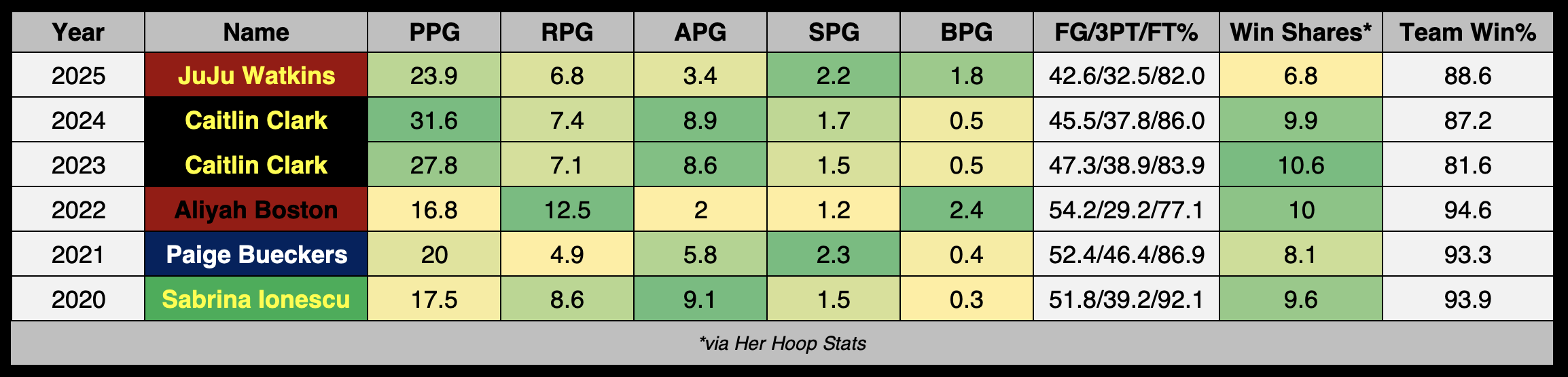 From there, the individual's stats have varied, though each of these players managed to fill the stat sheets across the board. Both of Clark's wins, along with Paige Bueckers and Sabrina Ionescu's, are from do-it-all guards who also happened to be extremely efficient from everywhere on the court. JuJu Watkins and Aliyah Boston also put up big numbers, but both also shine on defensive prowess with more than one steal and block per contest.