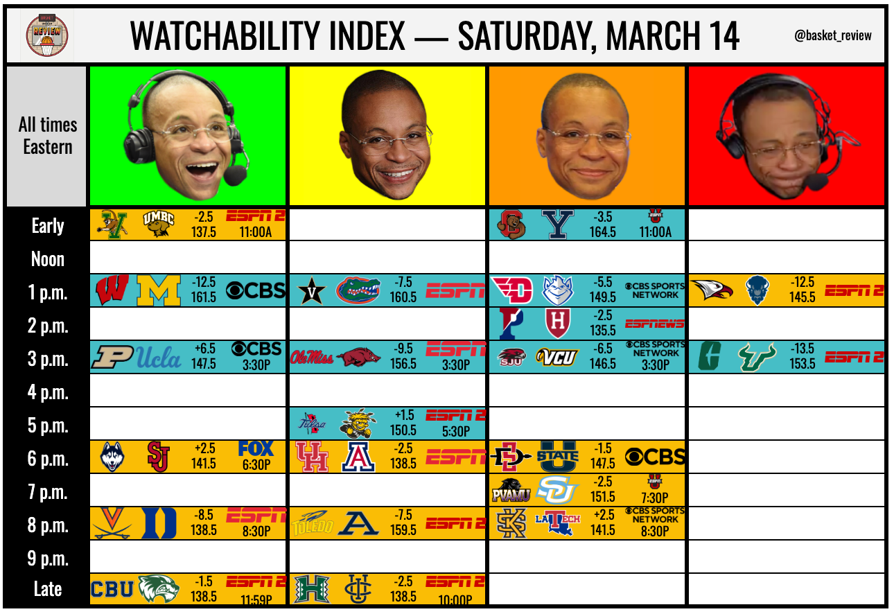 My beautiful, sloppy SWAC, back for one more ride this year buried amongst a ton of games most people will want to watch more. Southern has the efficiency edge but the two PVAMU battles this year were extremely chaotic and fun, with each team winning on the other's home court (PVAMU 89-85, Southern 87-82). These are two terrible defenses that foul profusely and attack relentlessly on the perimeter, so get ready for a long one.