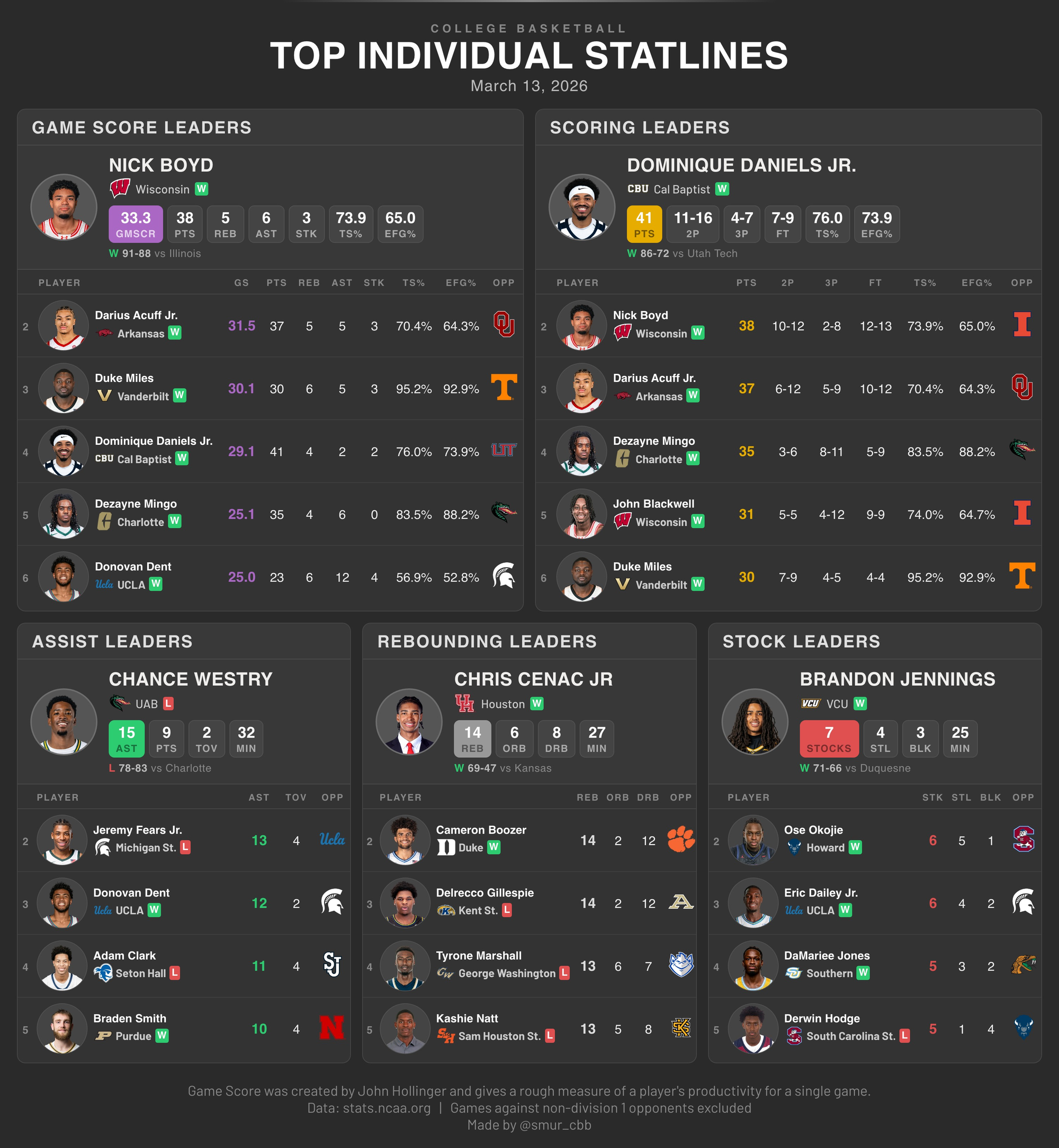 - Cal Baptist's normally gigantic edge on the boards against the average opponent was more or less neutralized. UVU lost the rebounding battle 32%-27%, but considering CalBap won this by +10.5% in their other games, I don't love it.