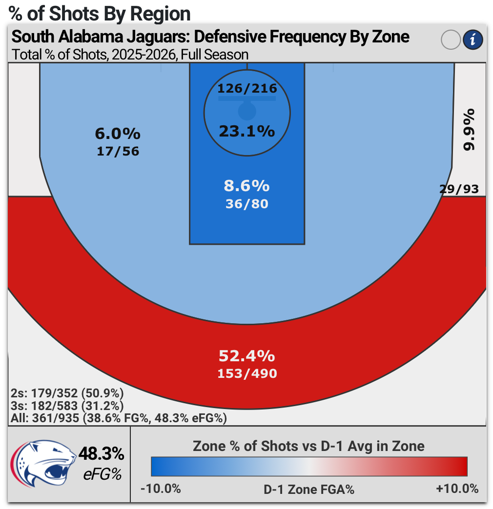 On the season, teams are taking just 30% of their shots inside of the paint against South Alabama, the lowest rate in the country. 23.1% of those shots come at the rim, and 8.9% of shots come in the paint outside of the rim. Those are the 13 lowest and #1 lowest ranks in the country respectively.