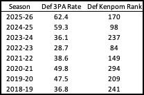 On the season, 56% of opponent shots are catch and shoot threes. When filtering out transition, that number jumps to 64.6%. And the one stat that probably best shows why this defense is what it is....