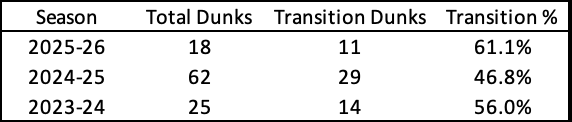 During his freshman season, over 50% of Carr's dunks came in transition, and that number dropped just below the 50% mark the following season. However, this year he has been lethal when getting out and running, helped in some capacity by Jeremy Fears emerging as one of the better point guards in the country. 61.1% of his dunks have come in transition this season, the highest in his career.