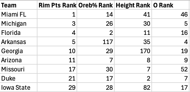 The main way that teams are increasing their rim points this season is by simply being bigger and stronger than their opponents. Sounds easy, right? To demonstrate, here is a table of the nine best power conference rim scoring teams this season.