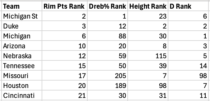 Look for power conference teams to try and emulate what Michigan and folks are doing next season. While it's obviously not easy to just add elite size and physicality, sacrificing spacing and speed for rim dominance so long as you have competent guard play and some shooting around them has clearly been an effective strategy. Playing big, winning the glass, and being the better rim team has been the name of the game for the best squads in the country this year. Unless you're Missouri, of course.