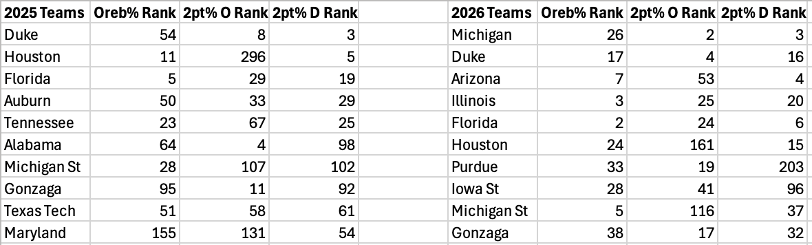 The thing is, this emphasis on physical offensive play is relatively new this year. Last season, only four top 10 KenPom teams were within the top 50 offensive rebounding teams, only three were within the top 50 2-point percentage teams, and only one was top 50 in both, the national championship Florida Gators. This year, all 10 of the top 10 teams are within the top 50 offensive rebounding squads, and seven of them are top 50 2-point offenses. The defenses are slightly less correlated, but paint a similar picture.