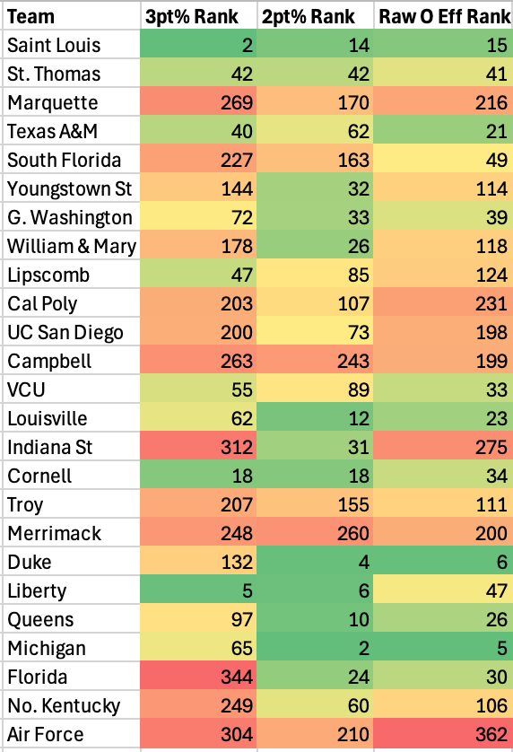 Saint Louis, St. Thomas, Texas A&M, George Washington, Lipscomb, VCU, Louisville, Cornell, Duke, Liberty, Queens, and Michigan are the 12 teams that are on this list and Top 100 in 2-point and 3-point percentage. Unsurprisingly, 11 of them are in the Top 50 in raw offensive efficiency nationally.