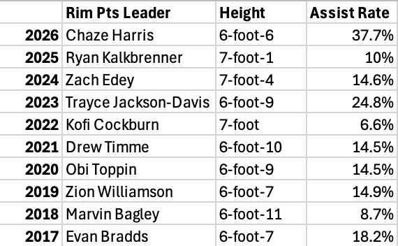 Not only is Harris the shortest guy on this list, and the only guard to ever lead the country in rim points in Synergy's 15-year database, (I acknowledge the season is not done yet), but he also laps the field with his assist rate. In other words, he's the only guy scoring at the rim this much while also being a team's lead initiator.