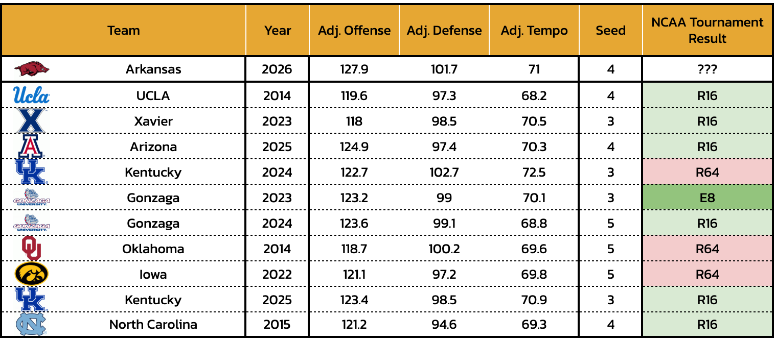 Because the offensive unit is so elite, it is very hard for a non-elite opponent to take down the Razorbacks. While top teams will have slip ups every once and a while, Arkansas does not have a single loss to a team ranked below 40 on KenPom. They've taken care of all the inferior opponents on their schedule.
