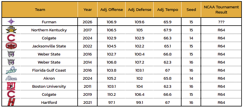 All of this roster strife indicates that Furman could be underrated analytically. The Paladins were rarely the best version of themselves, but they got healthy at the right time and pulled off the upset win in the conference tournament as the No. 6 seed.
