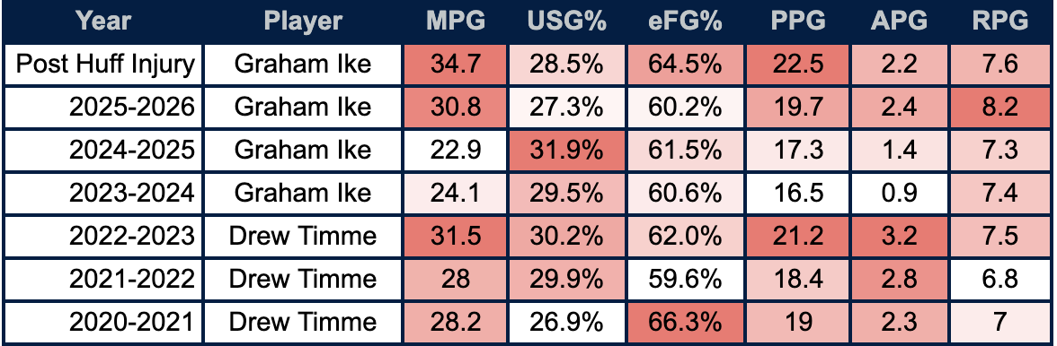 The role that Ike has taken on in Huff’s absence cannot be overstated. He’s remained the high usage monster while expanding his minutes per game from 30 minutes to nearly 35 for the final 15 games of the season. Most impressively, he’s actually held a higher shooting efficiency while putting up more attempts, going from 57.3% field goal shooting on the season to 60.7% this extended final stretch.