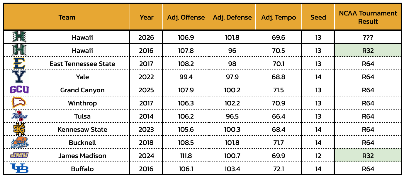 Rainbow Warriors, assemble! For the first time since 2016, the Hawaii Warriors are back in the NCAA Tournament, and just like last time, they've got their eyes on their program's ultimate prize: a Round of 64 upset over a mainland team with far more money and resources than Hawaii has. Under Eran Ganot, this has become a dominant mid-major defense, with this year's being the third-best defense in school history, ranking 42nd in defensive efficiency.