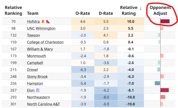 Analytics also agree that Hofstra is at its best against top competition. EvanMiya’s “opponent adjust” column displays this: