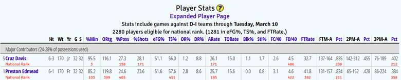 I mentioned the offense is inside the top 100 as well. That is generally due to the immensely skilled guard duo of junior Cruz Davis and freshman Preston Edmead, two lethal scorers who can get buckets from anywhere while also facilitating for others. Their overall profiles are impressively similar, and neither one ever leaves the court (click to enlarge):