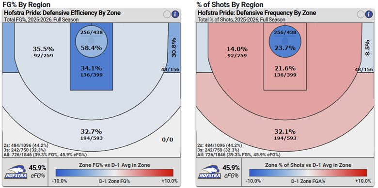 Hofstra is a balanced squad overall, residing inside the top 100 in both offensive and defensive efficiency per KenPom. But it’s the interior defense that has made their run towards a top 50 squad possible.