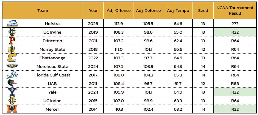 Hofstra earned a No. 13 seed at the NCAA Tournament. In terms of seed strength, the Tournament Index grades the Pride as the 18th-strongest No. 13 seed of the last 13 tournaments (out of 52 teams). For Hofstra, the TI projects an average of 0.24 wins given its seed and team strength.