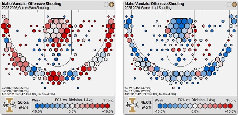 How often they make those attempts is the biggest indicator of Idaho's chances to win. In their 14 losses this season, the Vandals are just 29.2 percent from long range. In their 21 wins, they are shooting 38.6 percent.
