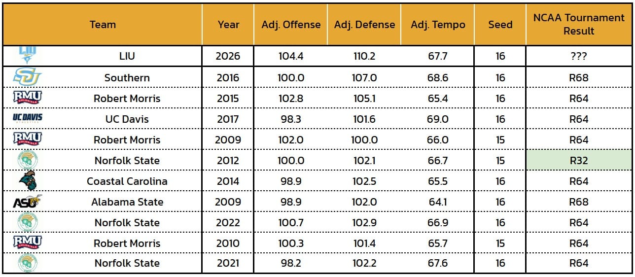 LIU earned a No. 16 seed at the NCAA Tournament. In terms of seed strength, the Tournament Index grades the Sharks as the 21st-strongest No. 16 seed of the last 13 tournaments (out of 52 R64 teams). For LIU, the TI projects an average of 0.06 wins given its seed and team strength.