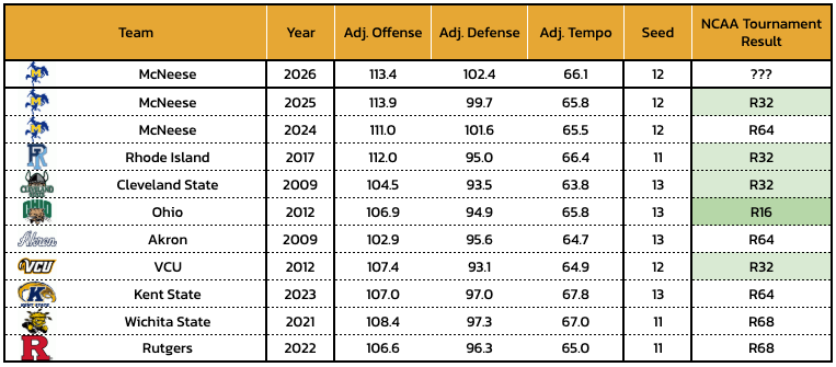 More than any team on the 12-seed line amongst the top mid-majors to earn an autobid, McNeese is extremely matchup-dependant. A team that struggles to handle the ball and has weaknesses keeping individual creators in front could have serious issues with this squad. But a team that has a conservative offensive and defensive approach may be able to take the Cowboys out of what they want to do.