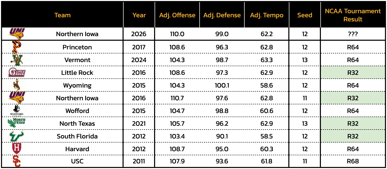 Northern Iowa has had its core six available for every game since Feb. 8, and has ranked 44th in adjusted efficiency over that time frame on Bart Torvik — ahead of teams like BYU, Villanova, Saint Louis, Clemson, Iowa, Utah State, and UCF.