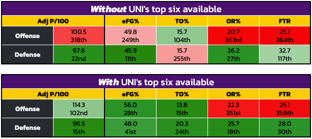 Even with the massive offensive improvement in games with all six of the core available, Northern Iowa's efficiency on that end of the floor still ranks equivalent to sub-100 in those games. A major reason for that is a near-complete lack of second-chance points (356th in OR%) and free-throw attempts (362nd in FTR). Additionally, many of their turnovers forced defensively are of the non-steal variety, leading to fewer transition opportunities; they rate in the 98th percentile for half court field goal attempt rate, per CBB Analytics.