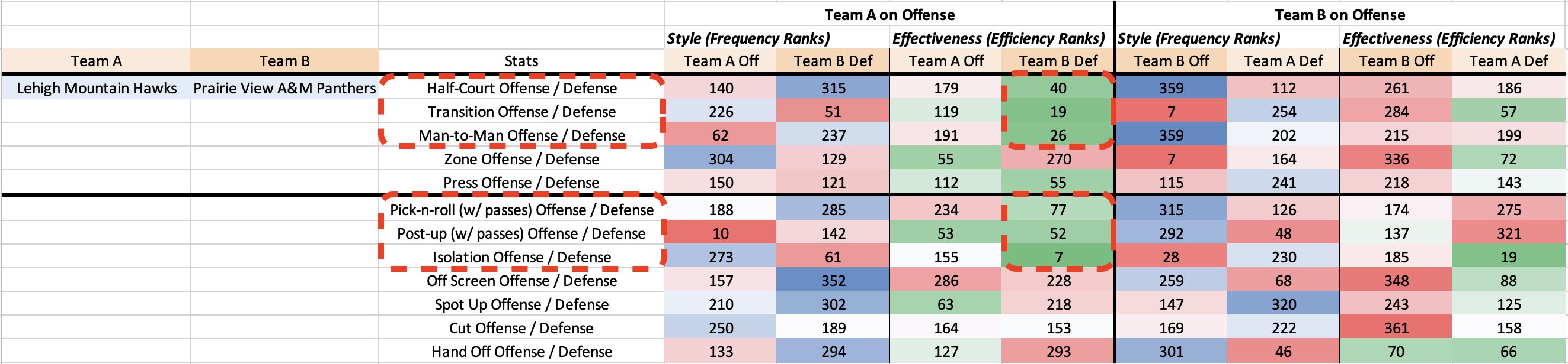 The table below is a statistical breakdown of Prairie View's matchup with Lehigh (data from Synergy), which contextualizes how they stack up nationally in a few key domains: