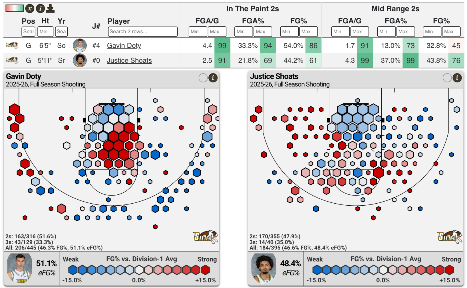 Doty (17.9 points, 7.0 rebounds) and Shoats (13.2 points, 4.4 assists) seek different spots on their non-at-the-rim attempts, with the former staying in the paint and the latter living more in the mid-range, but both are exceptionally accurate from their primary areas. Doty grades in the 86th percentile on non-at-the-rim paint 2s, while Shoats is in the 76th percentile for mid-range jump-shot efficiency.