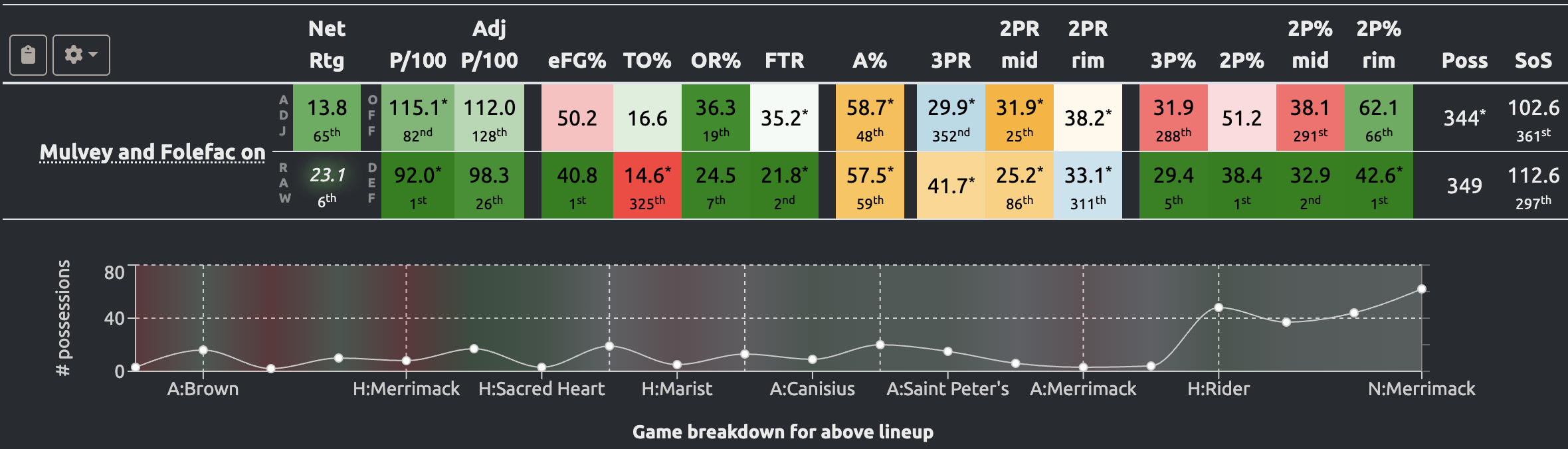 Siena does not block a ton of shots as a team, but Francis Folefac ranks 163rd nationally with a 5.4% block rate. Albeit in a small sample size, lineups with Folefac sharing the floor with 7-footer Riley Mulvey limit opponents to 98.3 adjusted points per 100 possessions — equivalent to the 26th-best defense in the country, per Hoop Explorer: