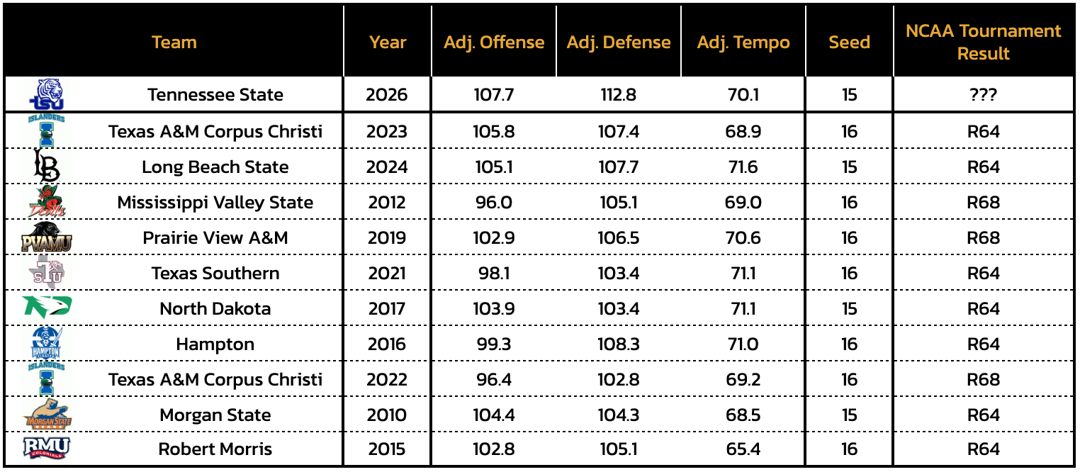 Should that be the case, the Tournament Index rates the Tigers as a slightly-above-average No. 16 seed (21st-strongest power rating out of 49 teams) compared to the last 12 NCAA Tournament fields. If the Tigers land above that projected seed, they would be the third-weakest No. 15 seed compared to the last 12 fields. The TI projects an average of 0.06 wins (excluding First Four) for Tennessee State given its projected seed and strength.