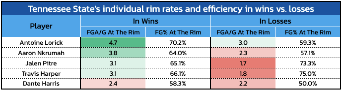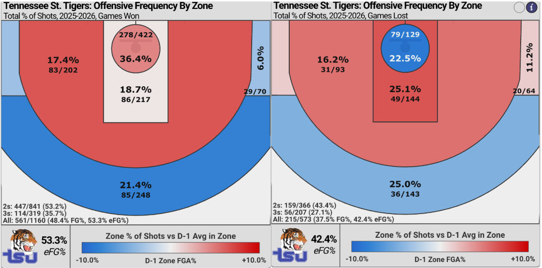 While Tennessee State ranks 33rd nationally for its points distribution coming on 2-point shots, it only ranks 328th in average 2-point attempt distance (7.0). When it is at its best, though, those shots are coming closer to the basket. Tennessee State shoots a similar efficiency at the rim, defined as within 4.5 feet by CBB Analytics, in wins (65.9%) versus losses (61.2%), but its attempt rates on such shots differ greatly.