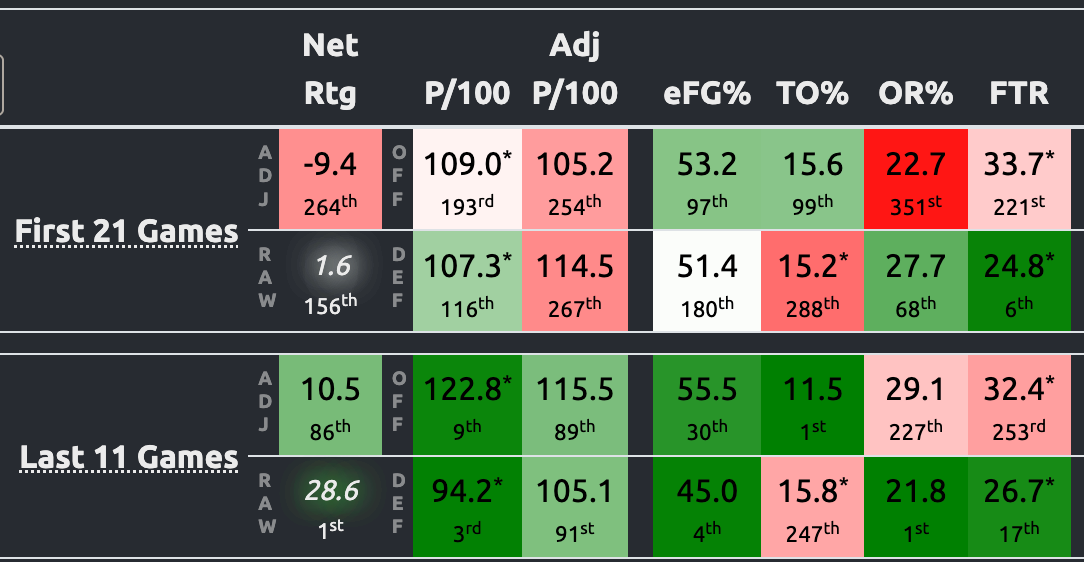 Offensively, UMBC's shooting efficiency is better over the last 11 games, but only marginally so compared to the first 21. The big difference is the increase in shot attempts by virtue of securing more second-chance opportunities (.291 OR% compared to a previous .227 OR%) and eliminating turnovers (.115 TO% compared to a previous .156 TO%). Combine the improved rebounding on both ends with limiting giveaways better offensively, and UMBC has gone from averaging 4.5 fewer field goal attempts per game than its opponents over the first 21 games to attempting 1.7 more per game over the last 11. The trending is superb.