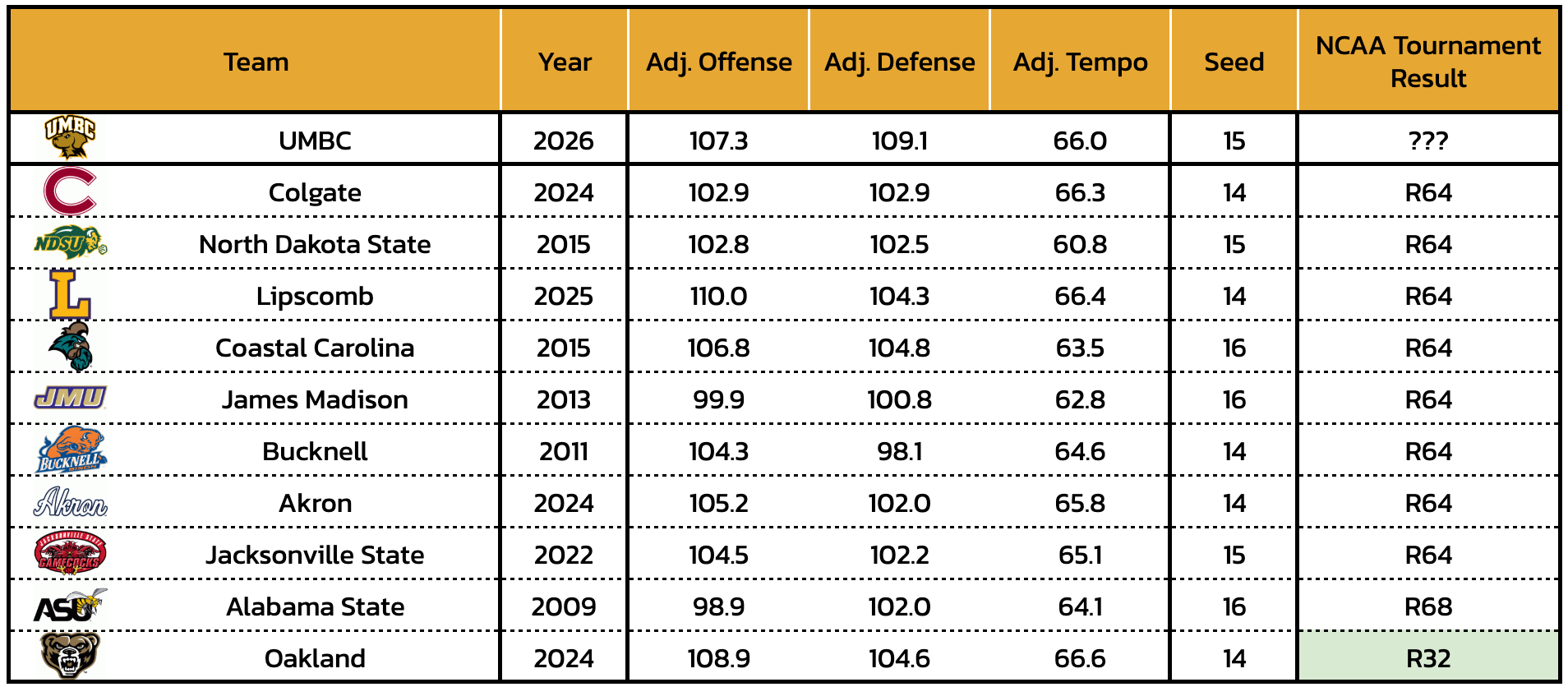 UMBC earned a No. 16 seed at the NCAA Tournament. In terms of seed strength, the Tournament Index grades the Retrievers as the 20th-strongest No. 16 seed of the last 13 tournaments (out of 52 R64 teams). For UMBC, the TI projects an average of 0.06 wins if it gets out of Dayton.