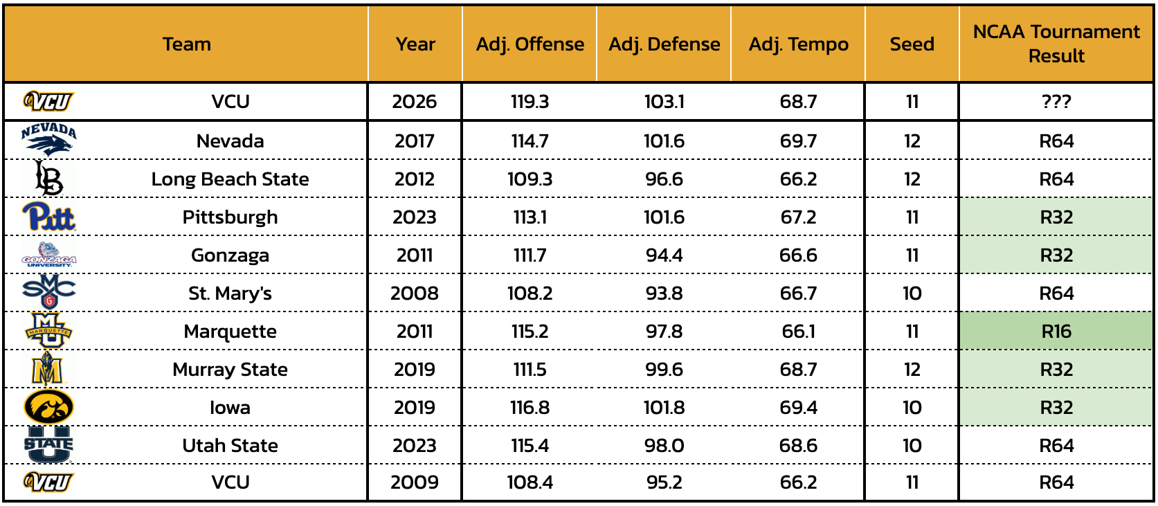 VCU earned a No. 11 seed at the NCAA Tournament. In terms of seed strength, the Tournament Index grades the Rams as the 20th-strongest No. 11 seed of the last 13 tournaments (out of 52 R64 teams). For VCU, the TI projects an average of 0.40 wins given its seed and team strength.