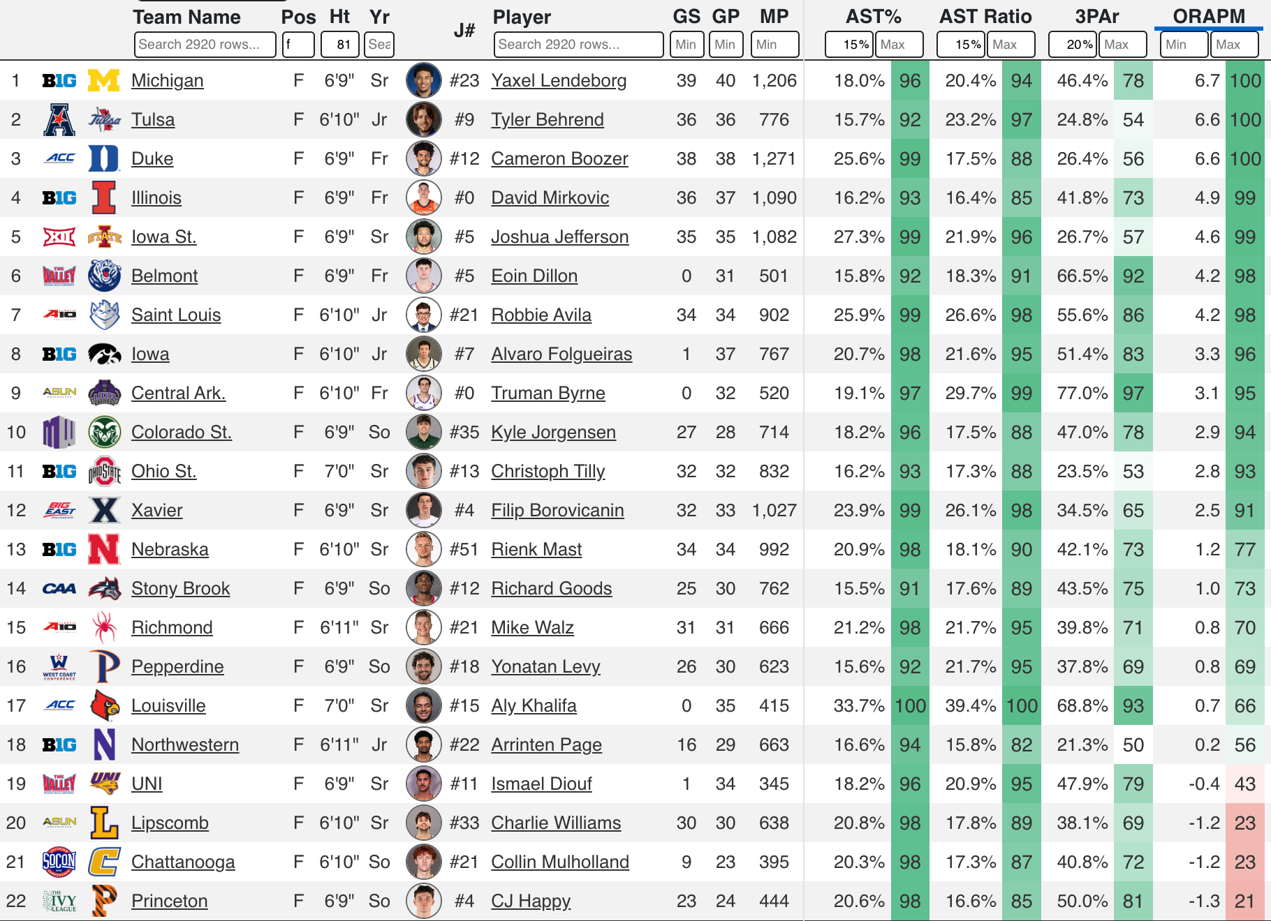 Only Mulholland on this list had a usage rate over 23% last year, but all seven of these guys were willing and capable passers while providing floor spacing and not dominating the basketball. Offensively, these are the perfect options to play the 5-spot and be a connector for an on-ball player.