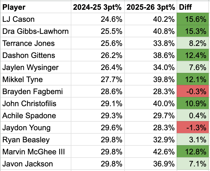 Anecdotally, I believe that great free throw shooters that have a 3-point heavy shot diet but shot poorly from deep over the course of a whole season are likely just caught up in the variance monster. So I took a look at every player in the 2024-25 season that shot above 80% from the charity stripe on 1+ attempt per game, but also shot 30% or worse from deep on a 40% rate or higher, and then I compared their 3-point percentage in the 2025-26 season.