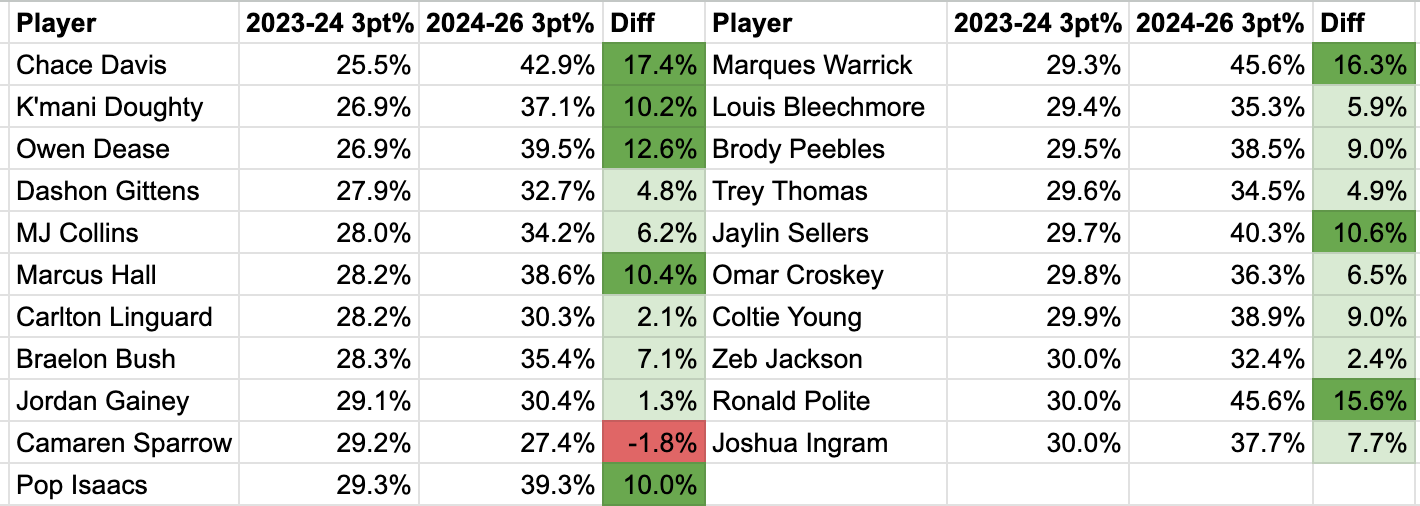 More of the same. Of the 21 players that qualified in 2023-24, 20 of them improved from deep over the one or two years since, with eight of them, or more than a third, jumping up more than 10%. It's pretty clear that if your coach entrusts you with a significant 3-point rate and you can make your free throws, you are more likely to have had a variance-y down year from deep, and you're not actually a horrible shooter.