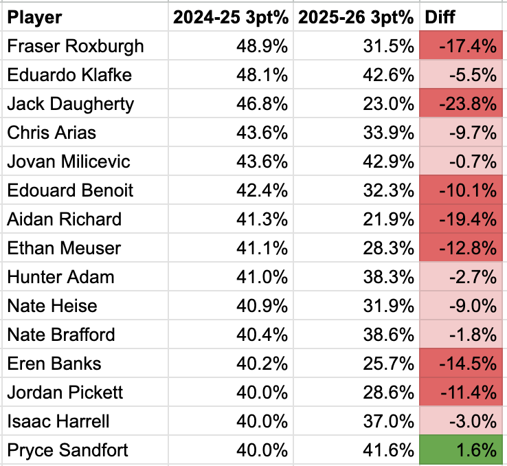 What is Pryce Sandfort doing on this list? Everyone else shot worse this season from deep, and seven of the 15 players shot at least 10% worse. Wildly, a third of these guys went from at least 40% to below 30% in just one year. So who are the candidates for this list in the transfer portal right now?