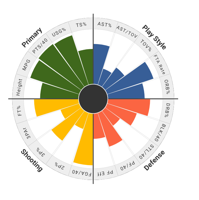 In Mighty's case, he really struggled to finish at the rim at Boston College, but did have a solid 25% dunk rate on rim attempts, and that's translated to a similar 32% rate at Mercer. Dunk rate is one of the more transferrable offensive skills for big men, because it's less dependant on the level of defender contesting the rim attempt than rim efficiency itself. As expected moving down from the ACC to the SoCon, Mighty's layup efficiency has gone way up to pair with his dunk rate, leading him to rank second in his conference in rim scoring.