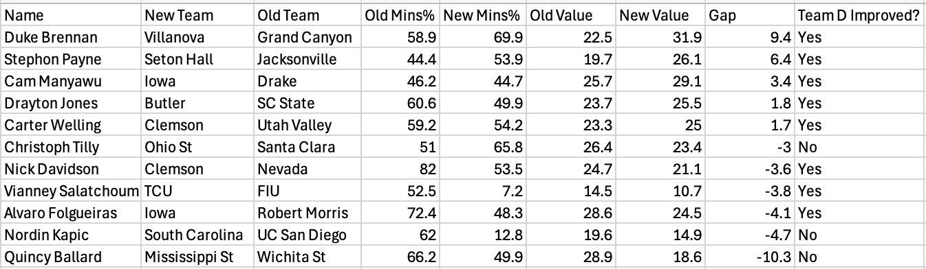 Now, let's compare that to this collection of the 11 big men who transferred from Top 150 defenses on mid-major teams last year to a power conference squad. While not everyone panned out, five of them saw increased RAPM + PER despite jumping up in level, and eight of the 11 play for a team that improved its defensive unit from the year prior.