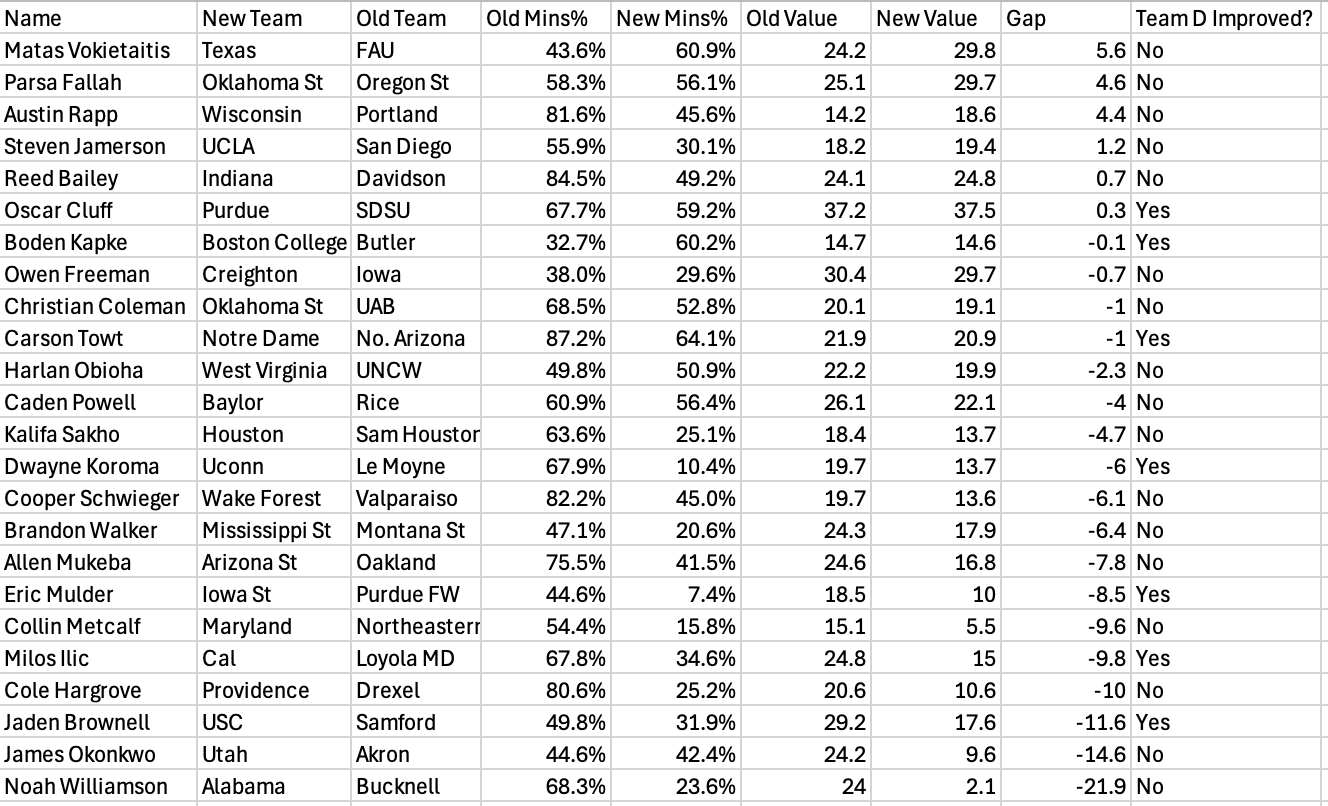 Above is a list of every player that transferred to a high major team after being the predominant starting big man on a sub-150th ranked defensive unit last season. By minutes percentage, only Matas Vokietaitis and Boden Kapke have seen a minutes increase. By a very rudimentary value equation of RAPM + PER (team value + box score value), only six of the 24 listed players have seen improvement this season. 11 players saw larger decreases than the highest increase, and Vokietaitis is a bit of an outlier in this query.