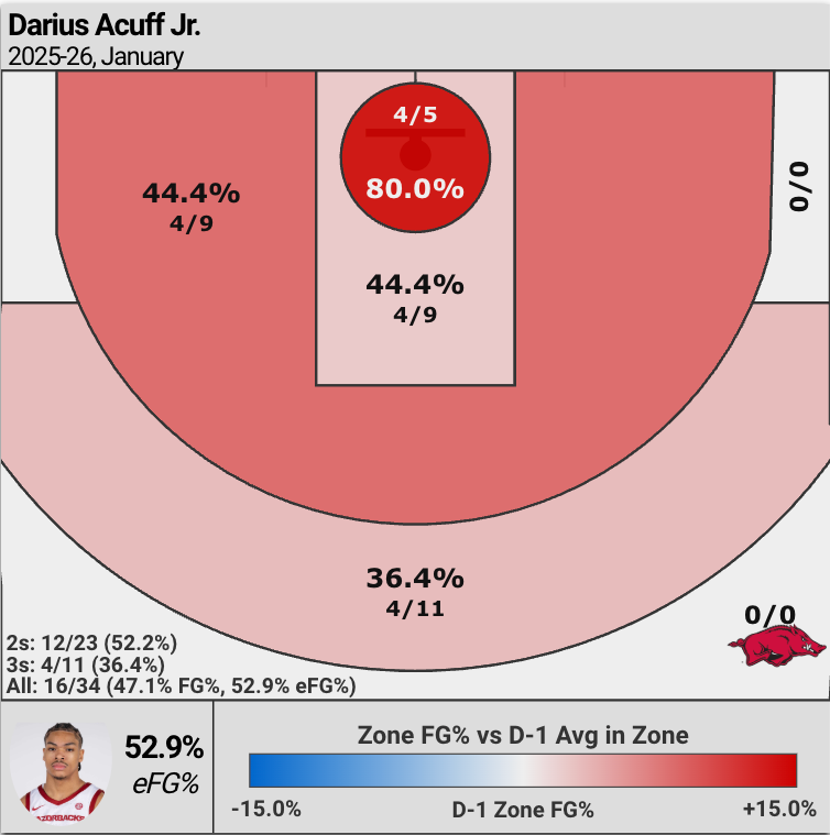 Since Thanksgiving Day, Arkansas freshman guard Darius Acuff has unlocked his game at the college level, averaging 22 points and 7.4 assists per game. In league play, he’s averaging 27.5 points and 6.5 assists.