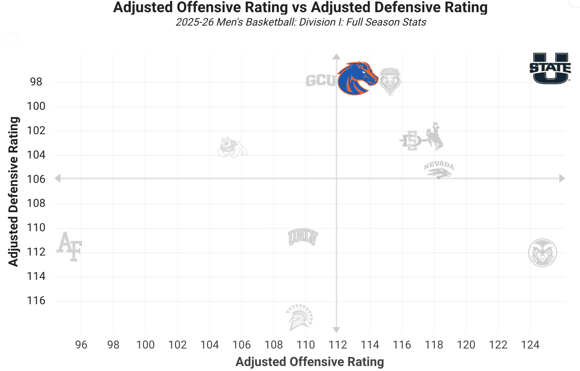 Utah State, on the season, has shown to be the best team in the conference on both ends of the court, and early conference play doesn’t suggest that that’s about to change. They’re first in the league in effective field goal percentage and offensive rebounding rate, while first in turnover rate and second in opponent field goal percentage on the defensive end.