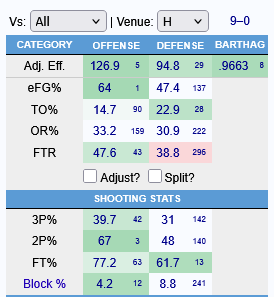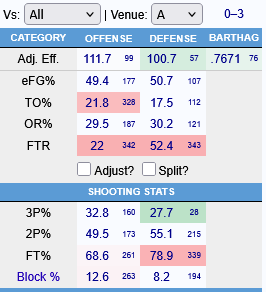 More intriguing to me are the superhuman home splits Tech is running from a 3PT% perspective. They're +9.2% in 3PT% at home, and opponents are shooting 27.5% despite VT's 3PT% SOS in these games being 33.1%, per Hoop-Explorer. Tech is great at shutting down any sort of transition play and forcing a half-court game defensively, but while they seem to play 1-on-1 on drives to the rim away from home, they bizarrely overcommit to drives at home and allow almost twice as many kickout threes from the paint.