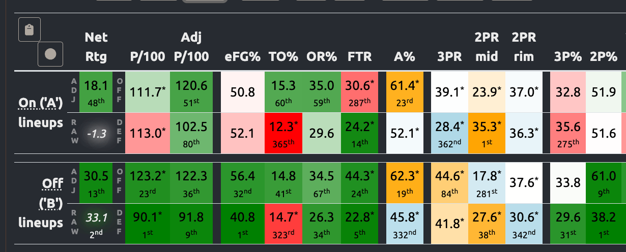 Obvious strength of schedule stuff is at play here, but even including games against top-200 opponents only, UNC is nearly 10 points worse per 100 away from home. The profound interior advantage they've shown at home entirely dissipates on the road, which is interesting to me when home Stanford gets a ton of foul calls (nearly 0.48 FTA to every 1 FGA) and forces a lot of turnovers in the frontcourt. If UNC gets behind early, the game script here surprisingly favors Stanford, especially given UNC's leakiness on the defensive end against better backcourts.